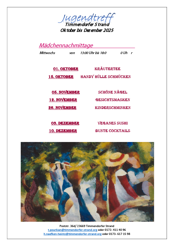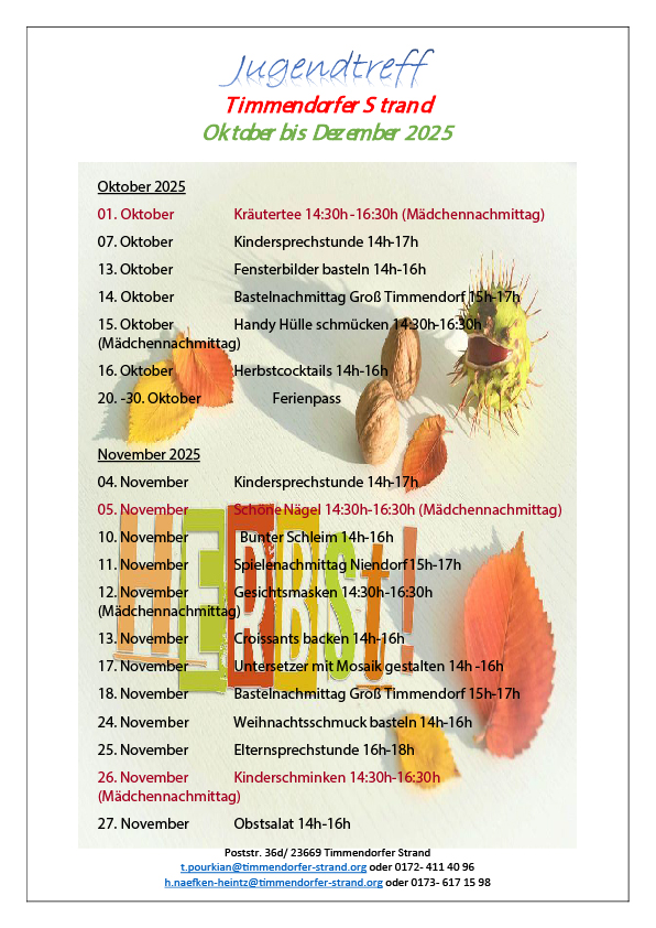 Solltet ihr aus einem wichtigen Grund einen reservierten Platz nicht in Anspruch nehmen können, gebt ihn bitte so bald wie möglich wieder frei, damit wir versuchen können, ihn über die Warteliste neu zu vergeben. Falls der Platz jedoch nicht neu besetzt werden kann, behalten wir uns vor, den Kostenbeitrag nur in Ausnahmefällen und in dem Fall nur vor der Veranstaltung zu erstatten.Programm im Jugendtreff Oktober bis Dezember