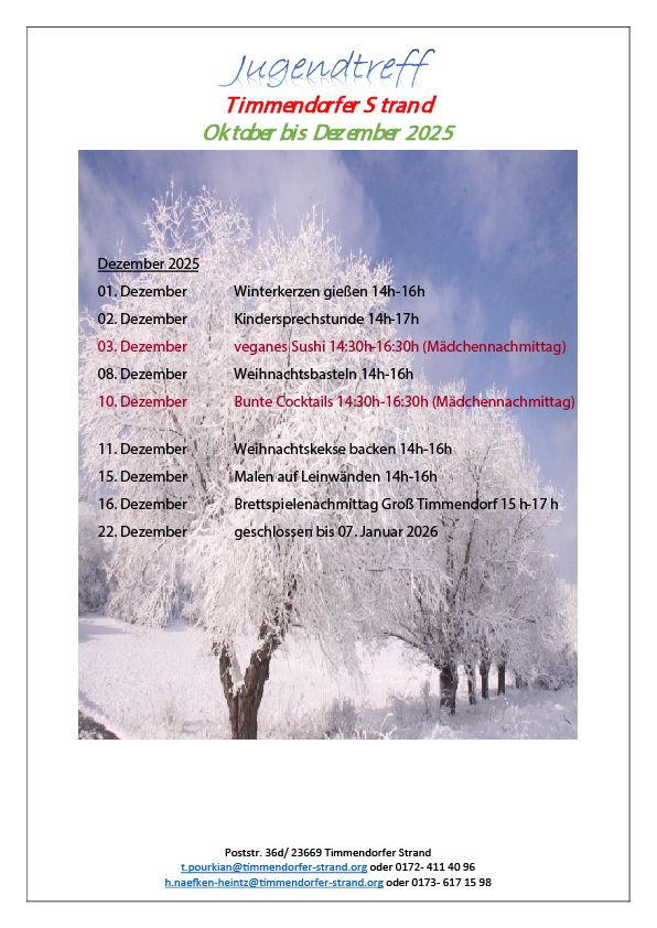 Solltet ihr aus einem wichtigen Grund einen reservierten Platz nicht in Anspruch nehmen können, gebt ihn bitte so bald wie möglich wieder frei, damit wir versuchen können, ihn über die Warteliste neu zu vergeben. Falls der Platz jedoch nicht neu besetzt werden kann, behalten wir uns vor, den Kostenbeitrag nur in Ausnahmefällen und in dem Fall nur vor der Veranstaltung zu erstatten.Programm im Jugendtreff Oktober bis Dezember